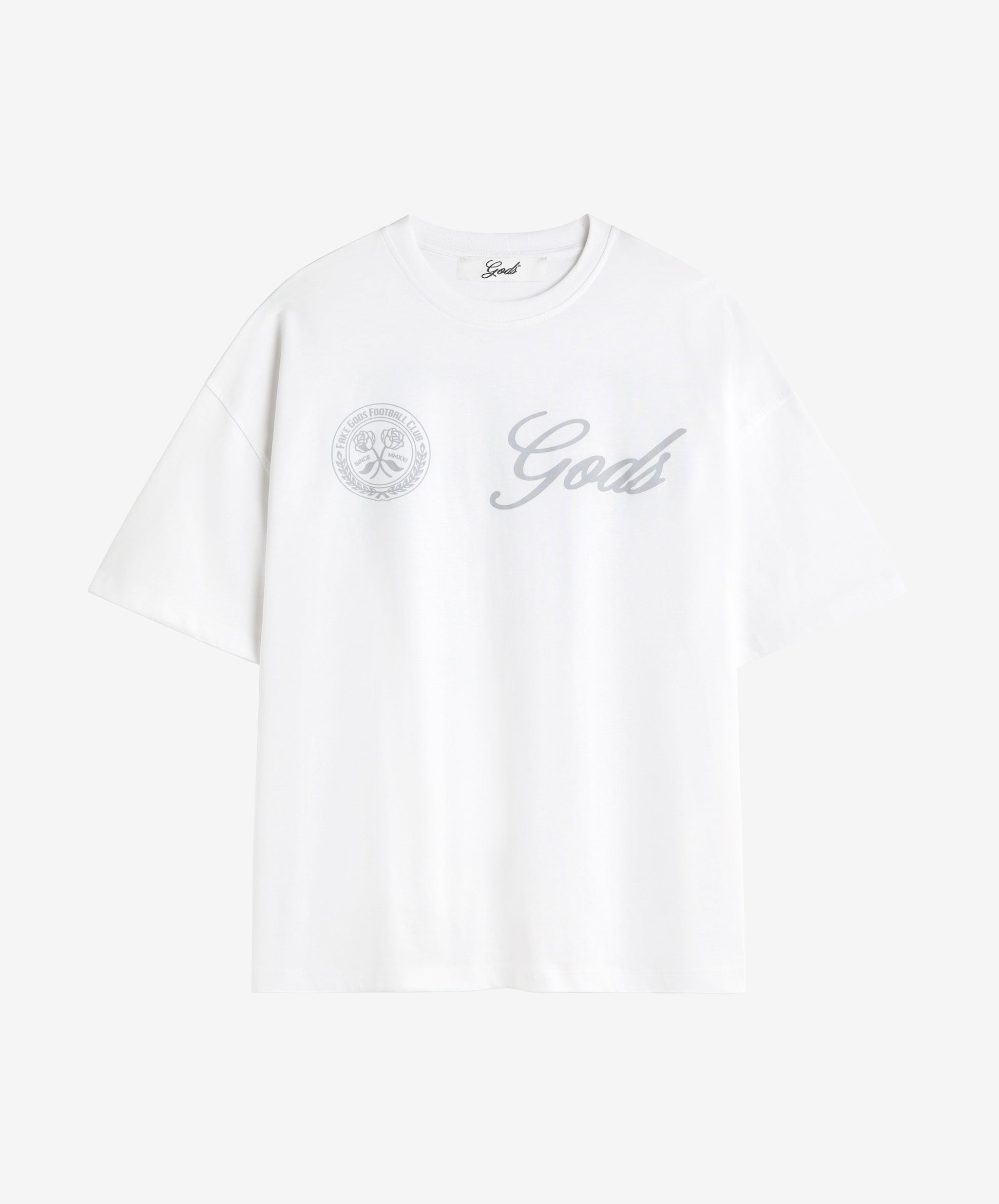 El diseño presenta nuestro logo Gods en el pecho y el icónico número 10 en la espalda, ambos en un sutil estampado gris que mantiene una estética limpia y sofisticada. Es la combinación perfecta de simplicidad, calidad y estilo. La única camiseta blanca que necesitarás.