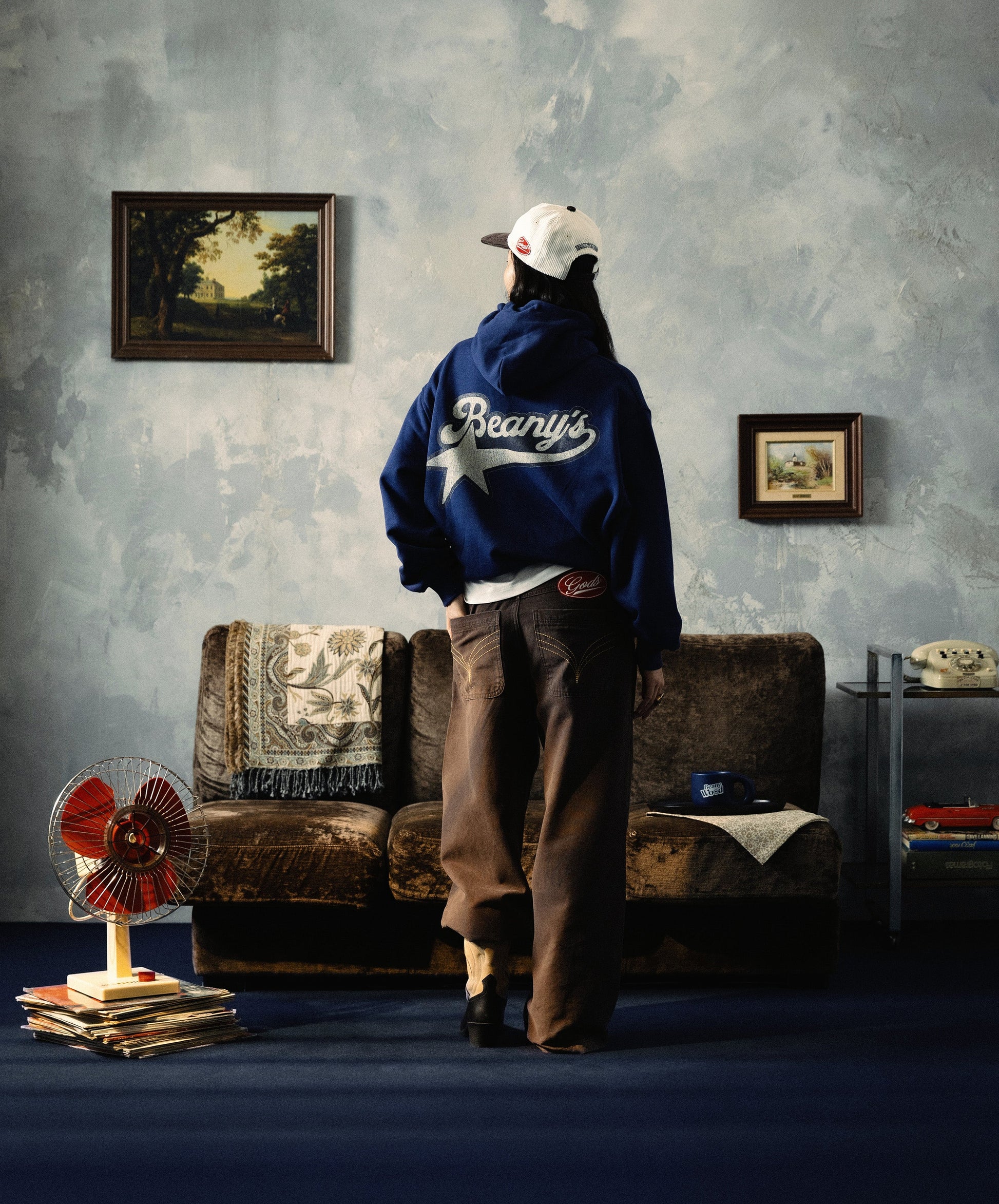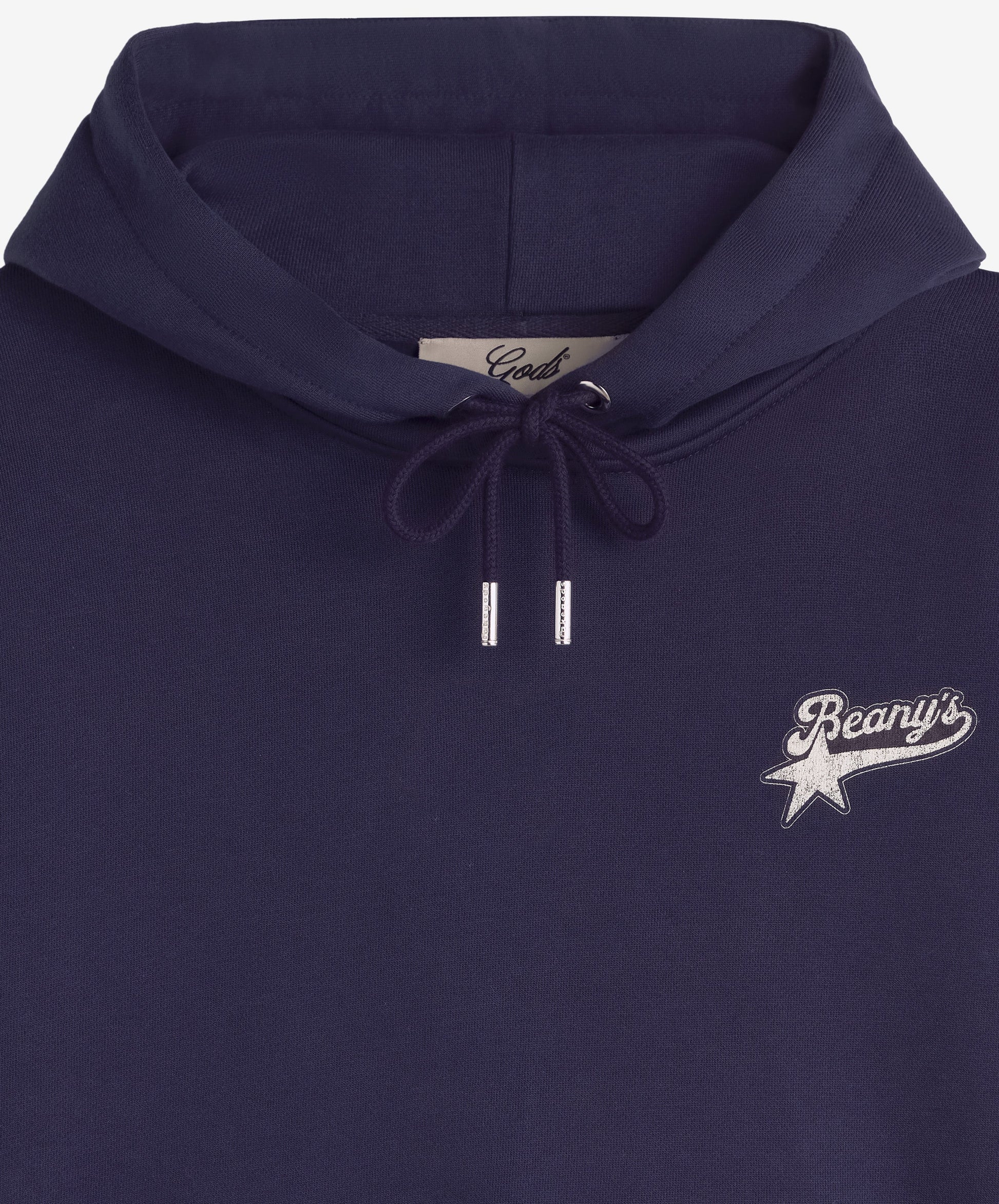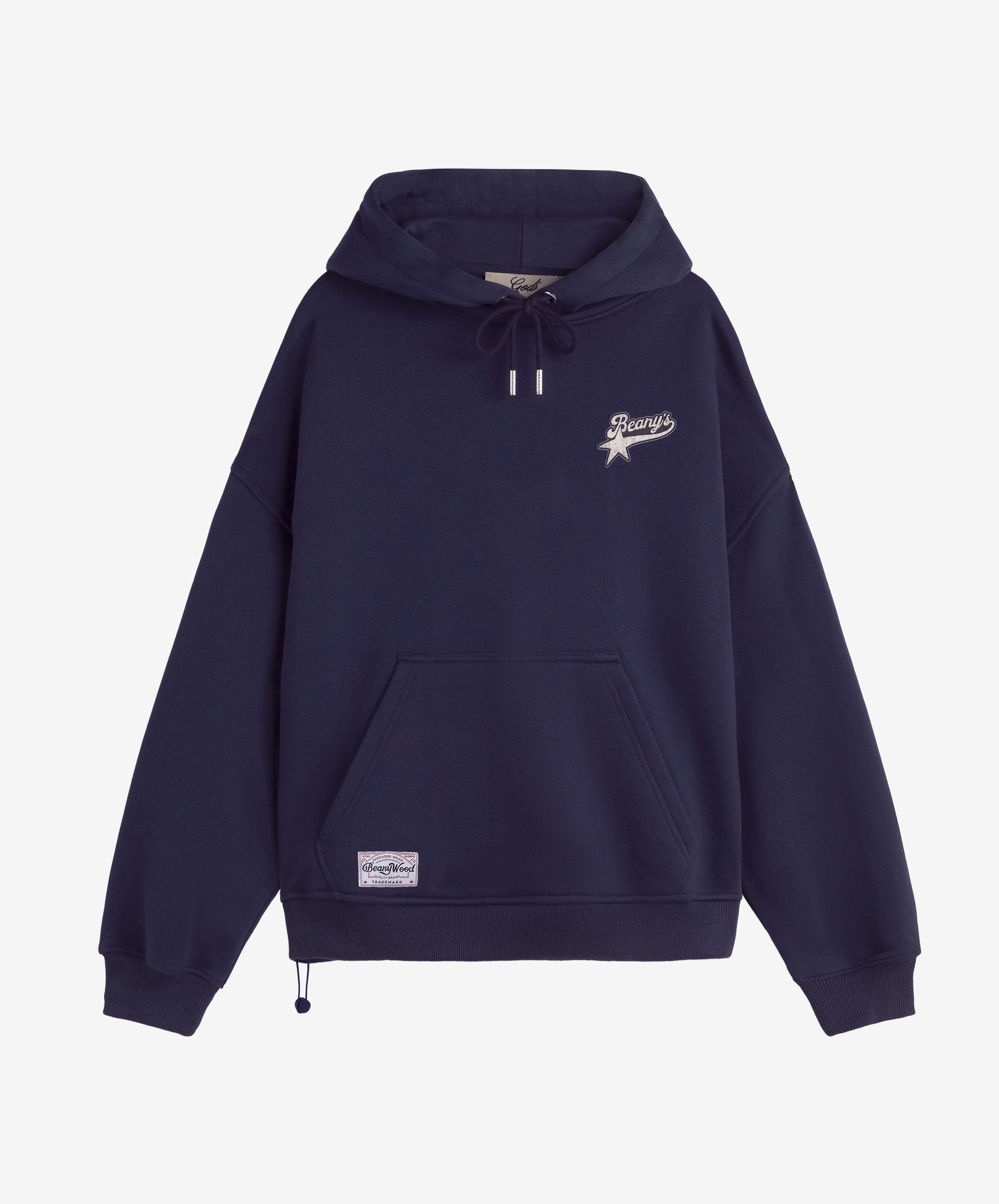 El frente es minimalista, con un sutil logo bordado de la marca que le da un toque discreto. Sin embargo, el protagonista de la sudadera es el diseño de la espalda: la palabra Beany's está impresa en una tipografía curva y vintage, colocada sobre una gran estrella, evocando el espíritu de los equipos universitarios.