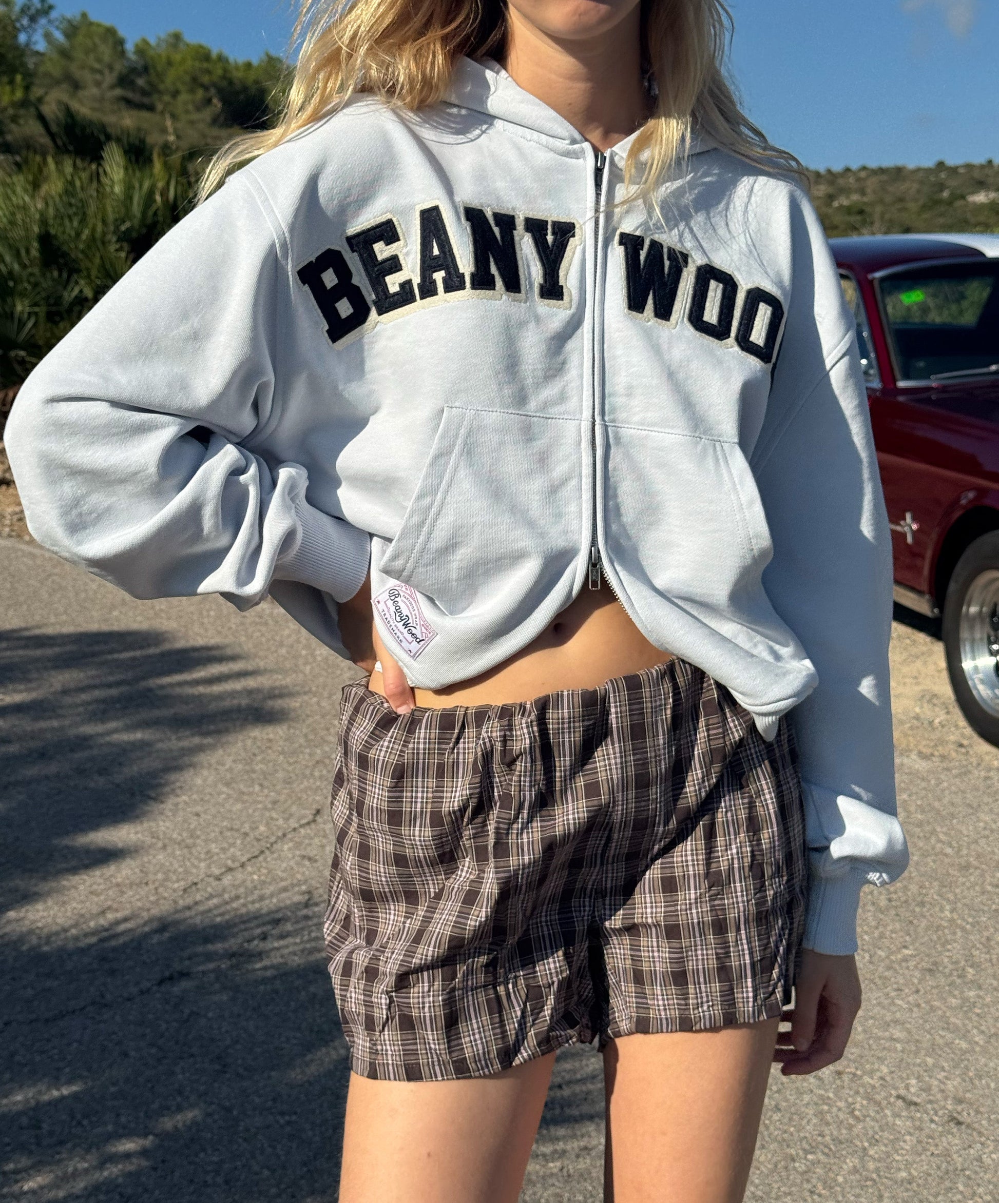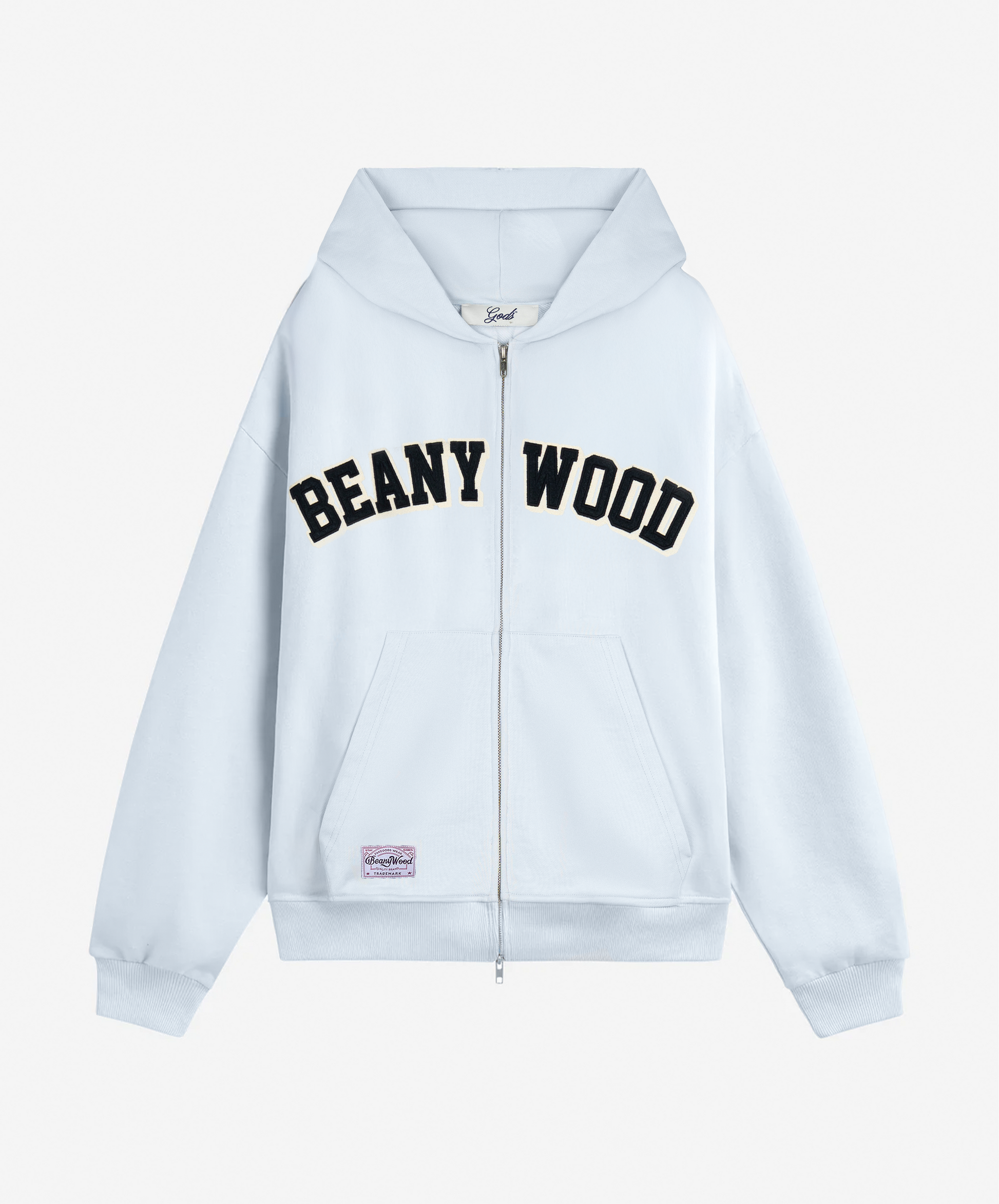 El diseño se centra en un bordado distintivo con la palabra "Beanywood" en letras mayúsculas, que le da un toque college y refuerza su aire casual. Su ajuste oversize y el bajo con cordón le otorgan una silueta contemporánea.