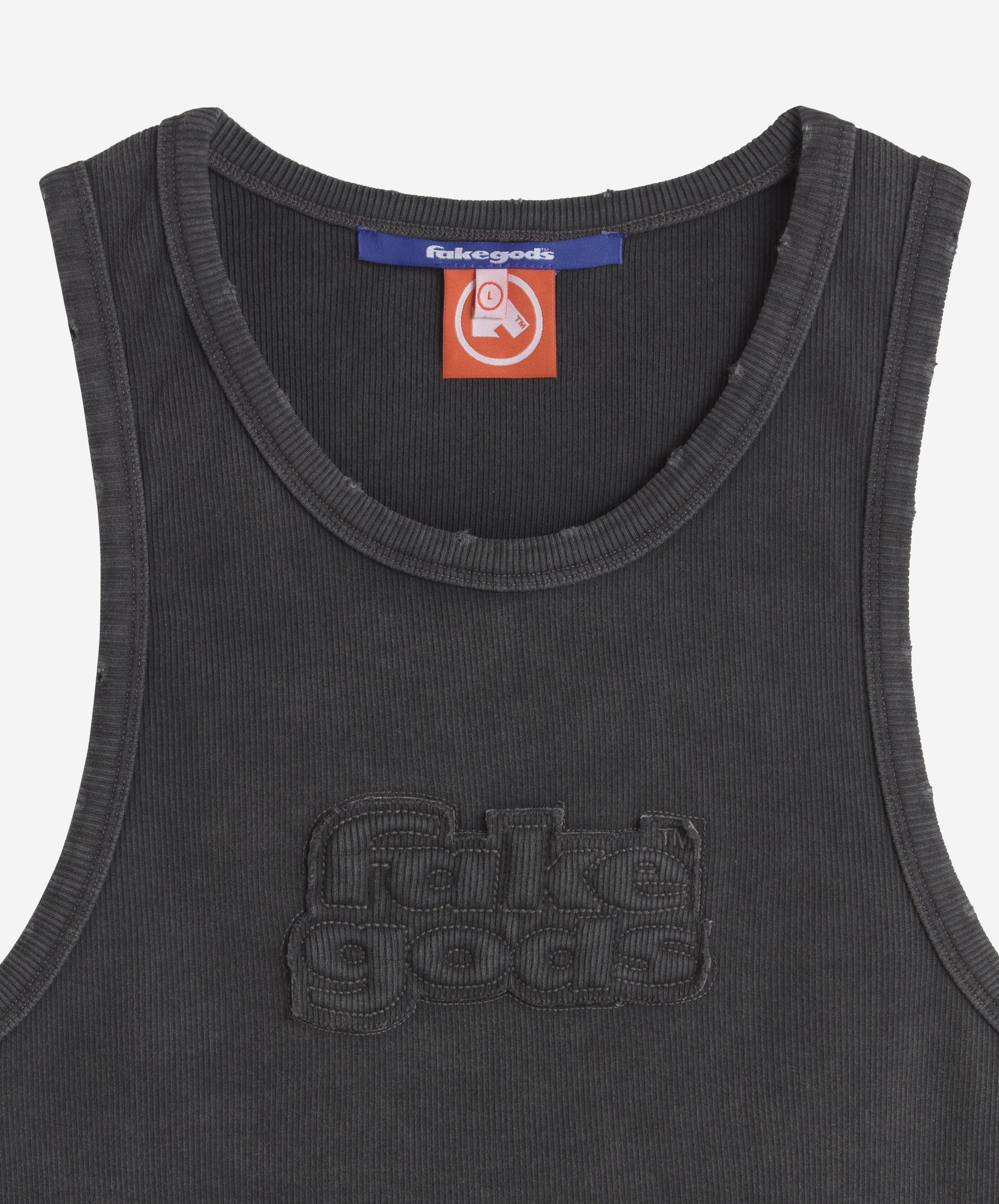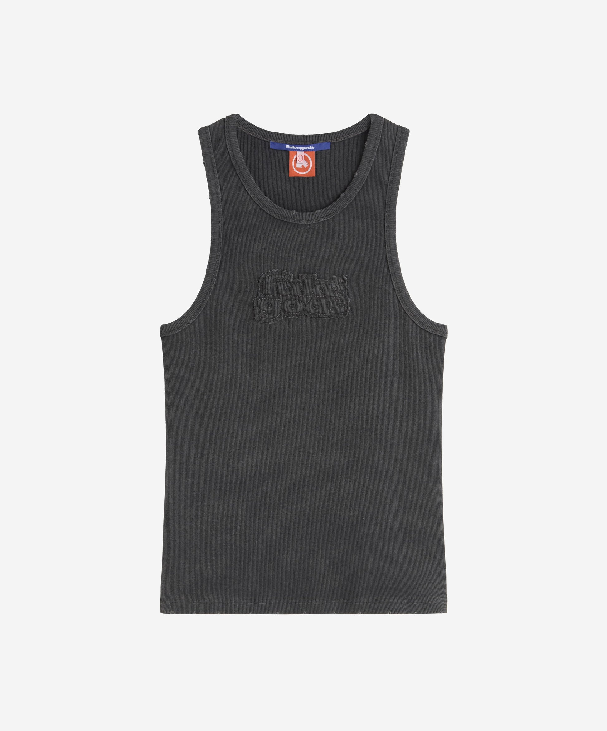 Camiseta de tirantes de algodón elástico, con lavado en tono gris oscuro que le da un acabado desgastado y textura vintage. El logo de Fakegods va bordado en el pecho, al tono, creando un relieve limpio y discreto. Tiene un fit ajustado y el tejido es cómodo, con elasticidad. Una básica con carácter, pensada para el día a día o como primera capa.