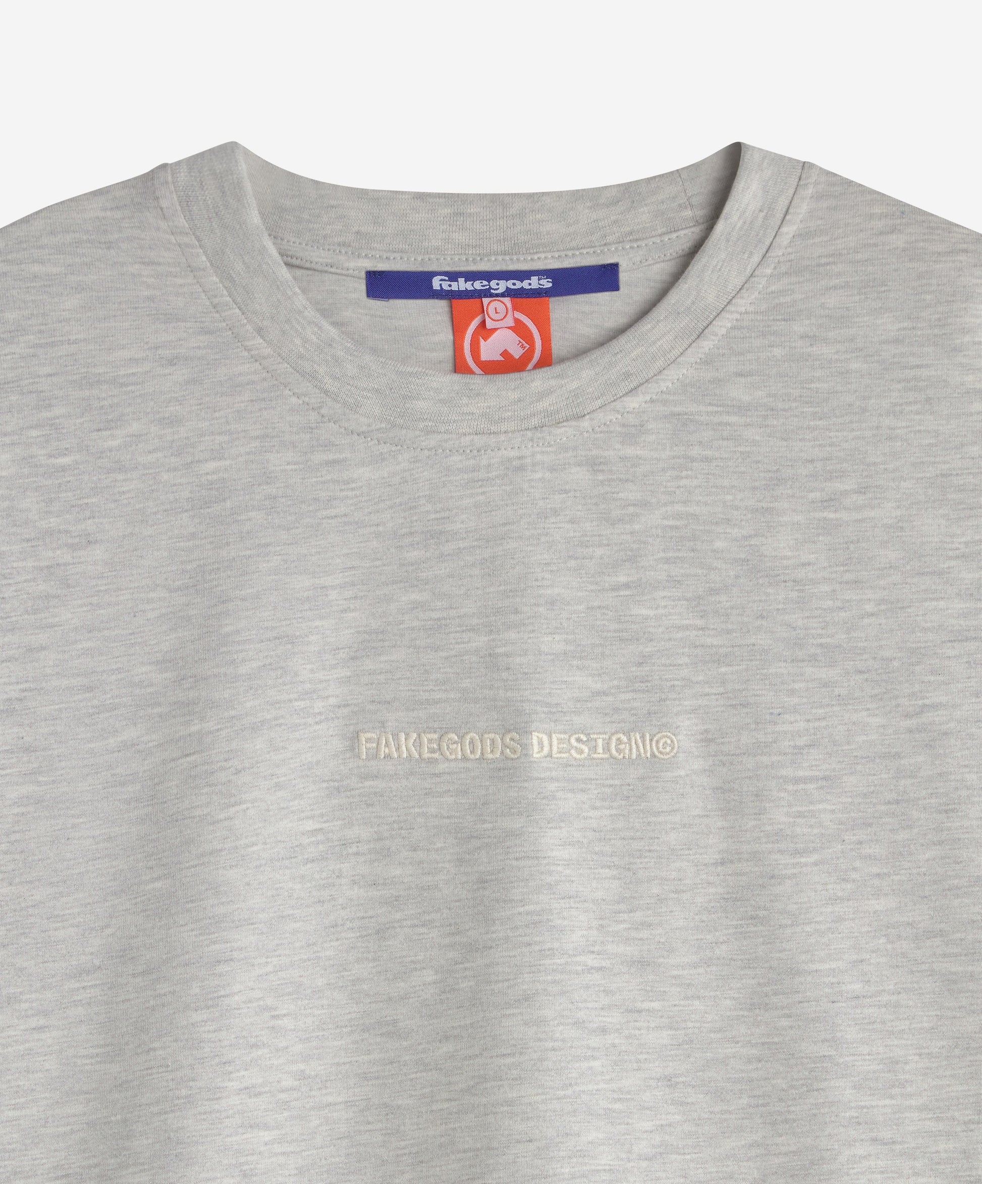 Camiseta de algodón en color gris jaspeado, con estampado en la espalda y bordado tonal en el pecho. Tiene un fit amplio, cuello de canalé y etiqueta tejida en el interior. Forma parte del conjunto “FG DESIGN”, combinando con los shorts del mismo tejido. Ideal para llevar a diario, por separado o en total look.