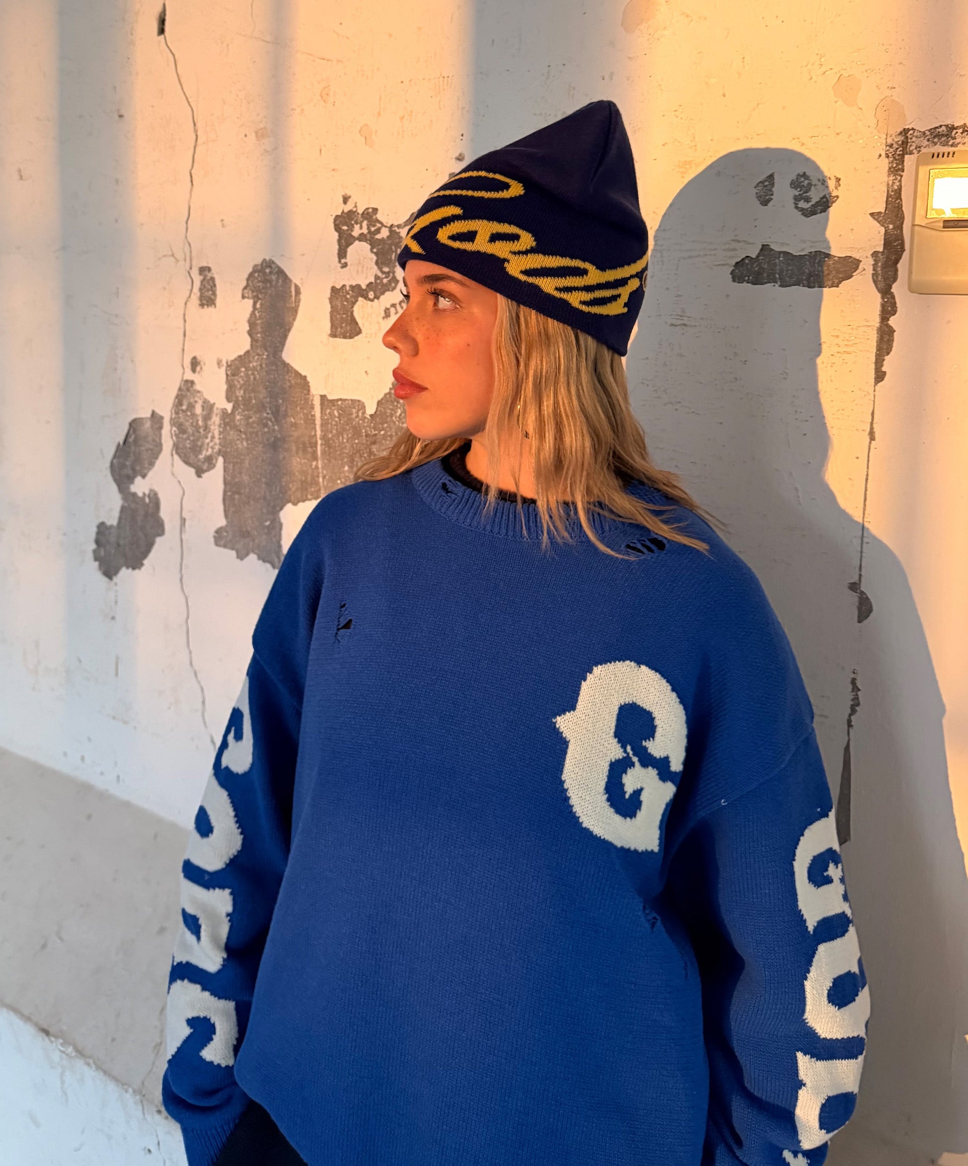 Haz una declaración audaz con nuestro G Side Knitted Sweater Blue, una pieza que canaliza la energía rebelde del estilo college con una ejecución de punto premium, es un clásico atemporal con un toque moderno y desenfadado