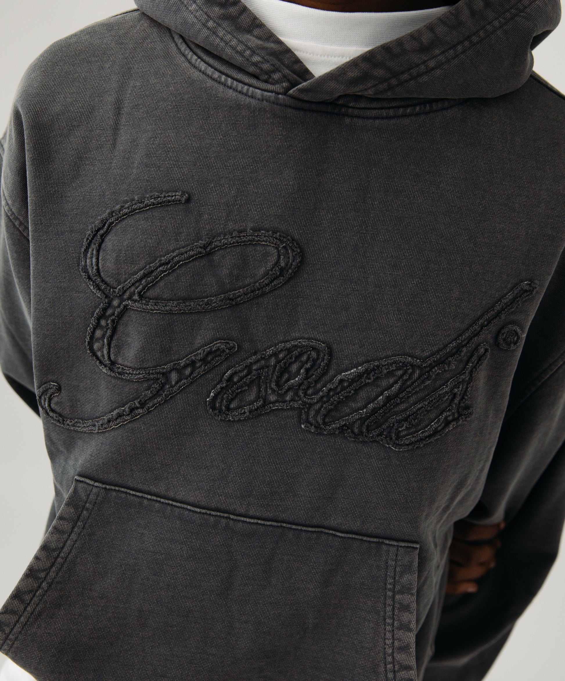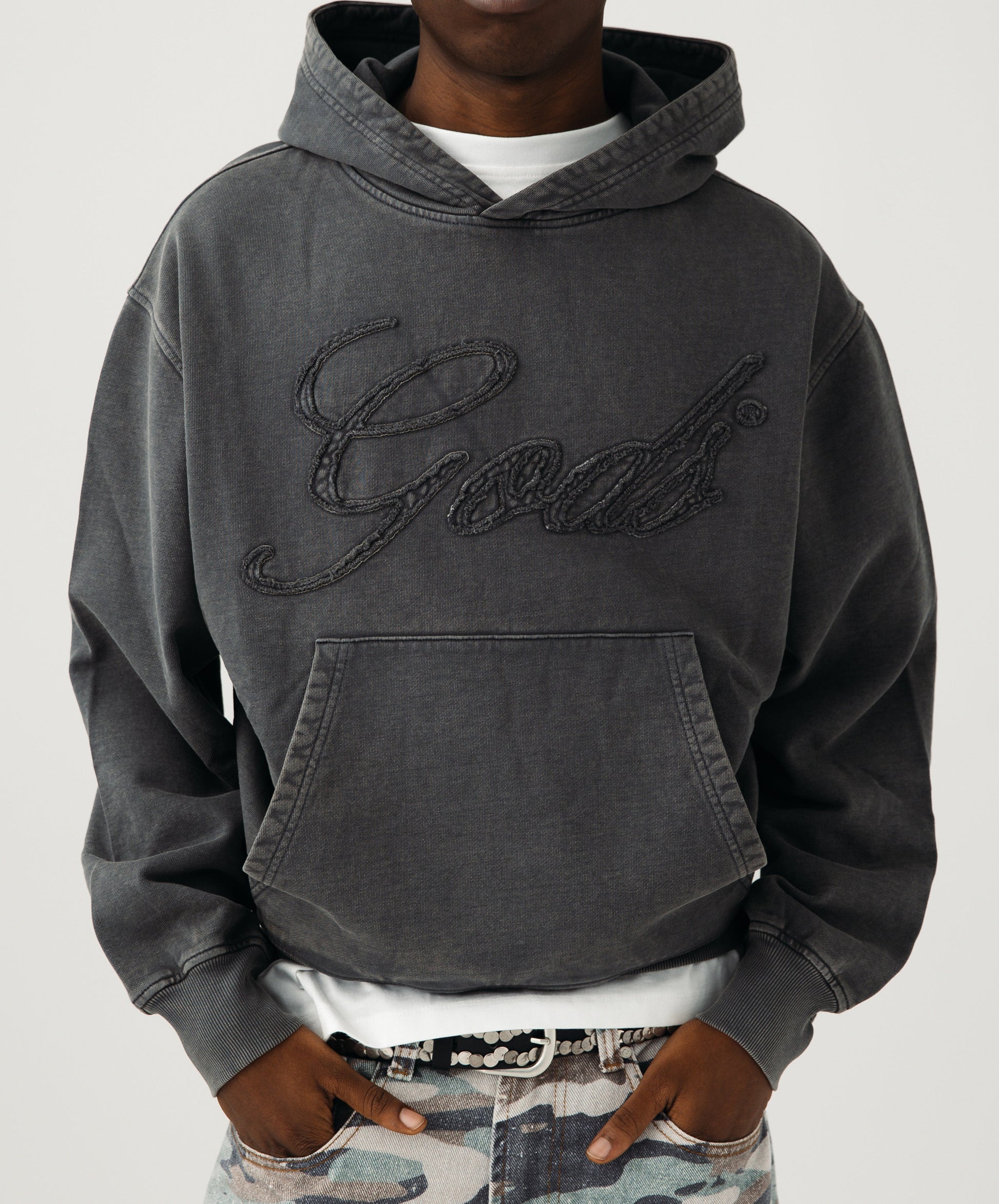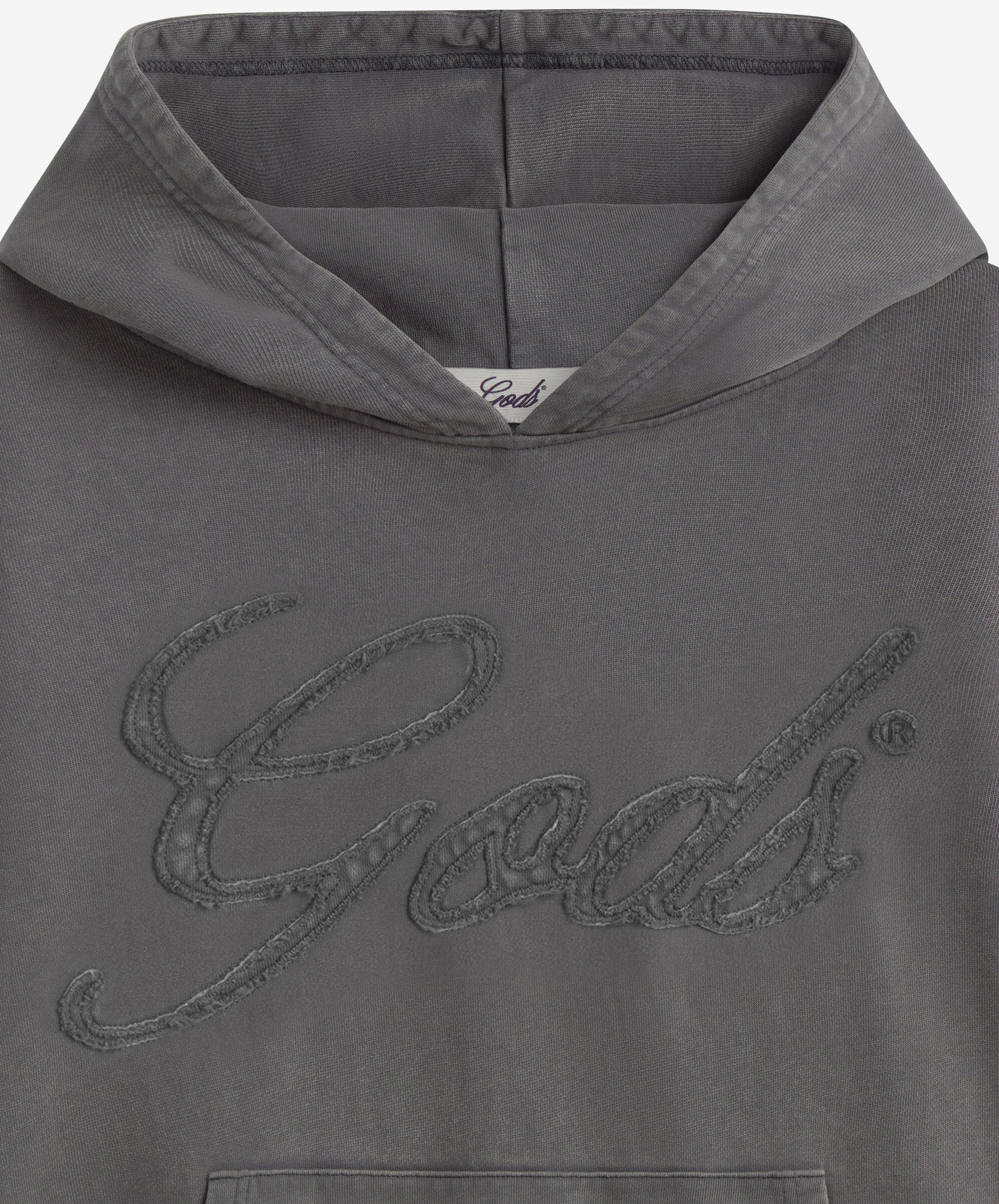 Confeccionada en un algodón de alta calidad con un acabado lavado, esta prenda ofrece una suavidad única y un aspecto ligeramente desgastado desde el primer día. El protagonista es el logo "Gods" bordado en el pecho, realizado tono sobre tono con un distintivo borde deshilachado que añade una dimensión táctil y un carácter artesanal inconfundible.