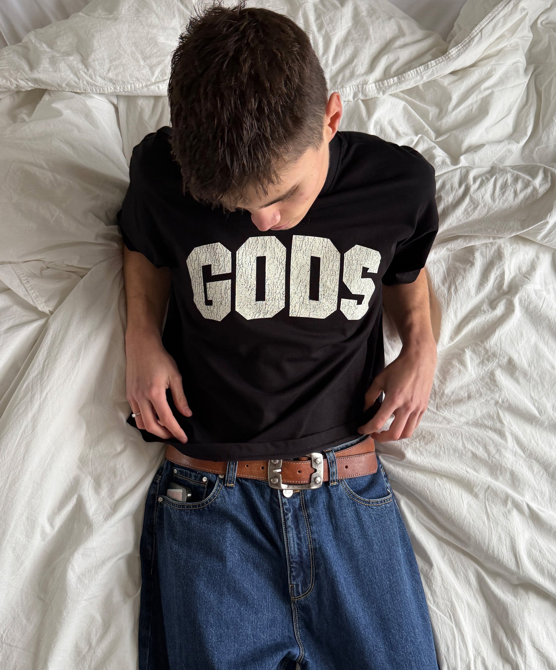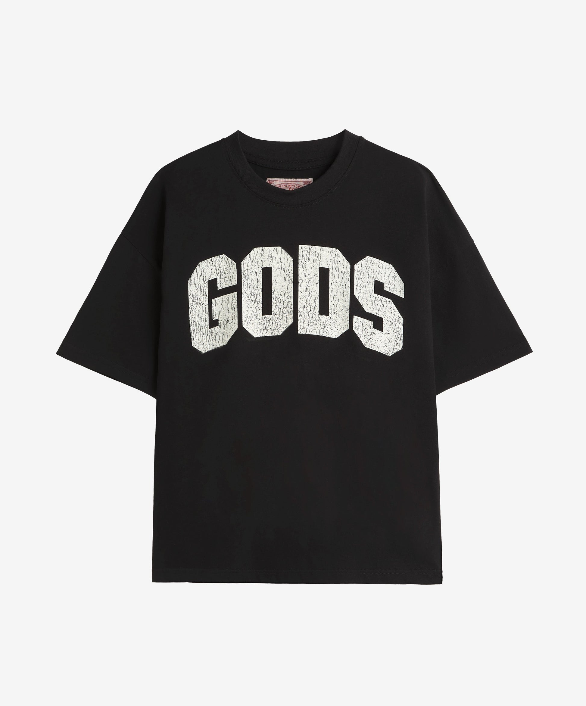 Confeccionada en algodón de tacto suave, esta camiseta ofrece comodidad y estructura para el uso diario. Su color negro potencia la presencia del logo GODS en el frontal, convertido en el eje visual del diseño y en un símbolo reconocible de la marca.