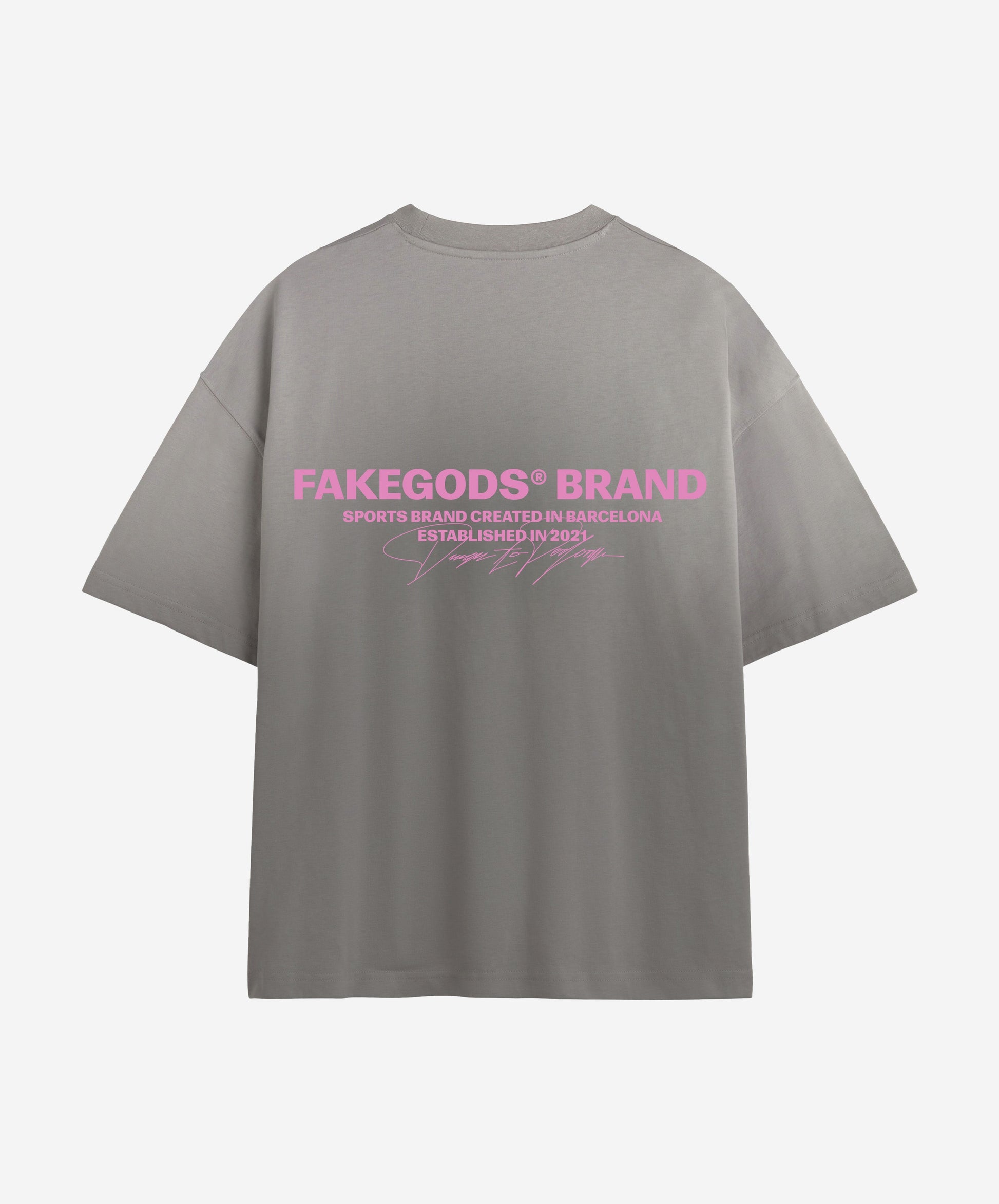 La Signature Tee de Fake Gods® es una declaración de marca con estética limpia y contundente. En un tono gris profundo, esta camiseta de corte relajado destaca por su gráfica en rosa vibrante: en el frente, un sutil logotipo en el pecho izquierdo; en la espalda, una composición tipográfica con el nombre de la marca, un mensaje conceptual y una firma manuscrita que refuerza el carácter distintivo de la prenda.