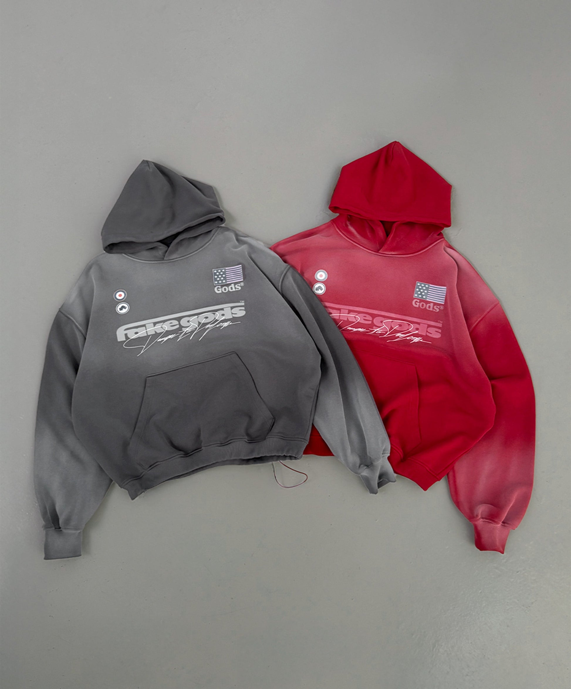 En el frente, presenta el icónico estampado “fake gods” en tipografía bold con firma en estilo manuscrito, aportando un toque distintivo. Además, incluye parches gráficos en el pecho —entre ellos una bandera estilizada y detalles circulares— que refuerzan la estética contemporánea de la prenda.