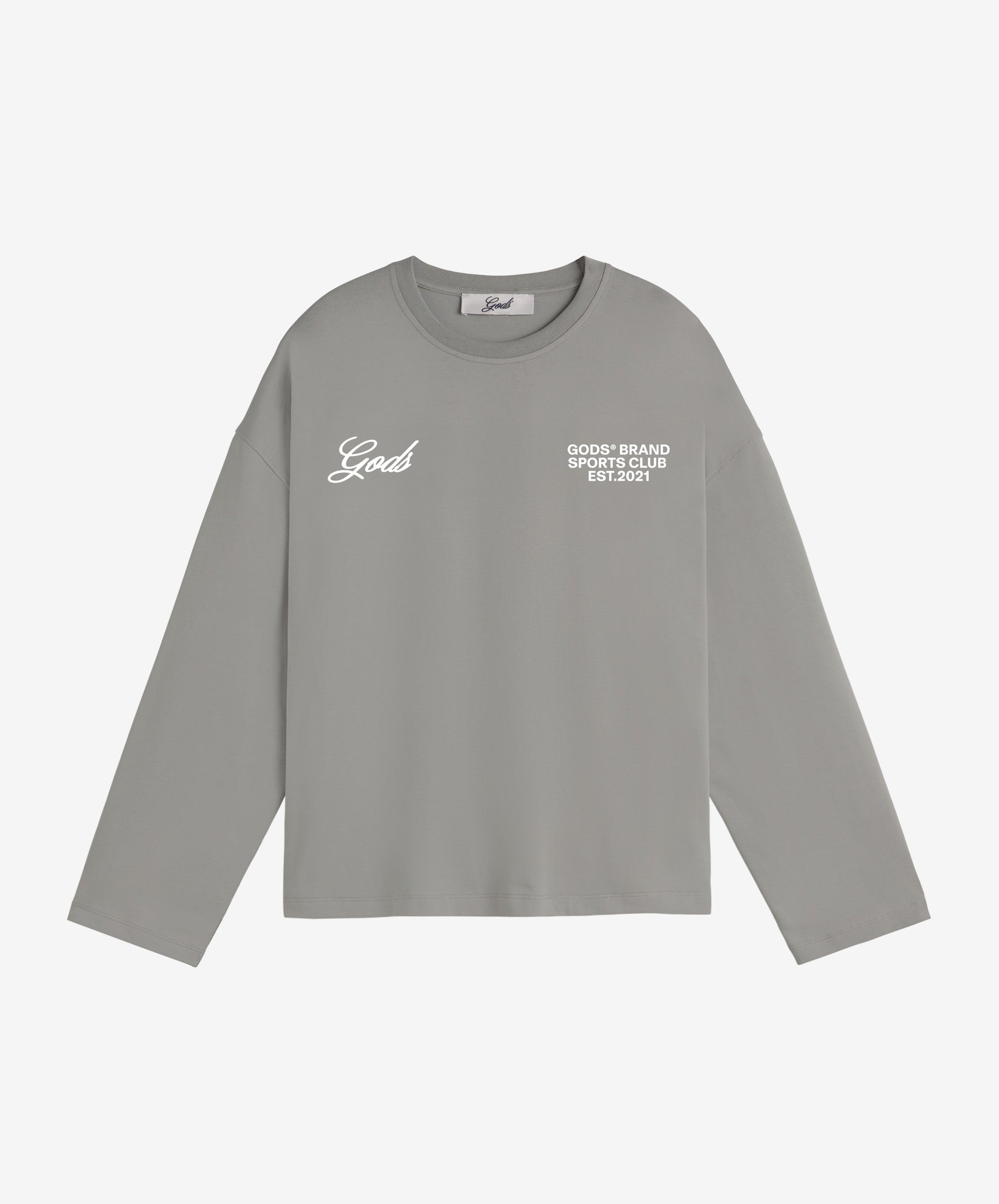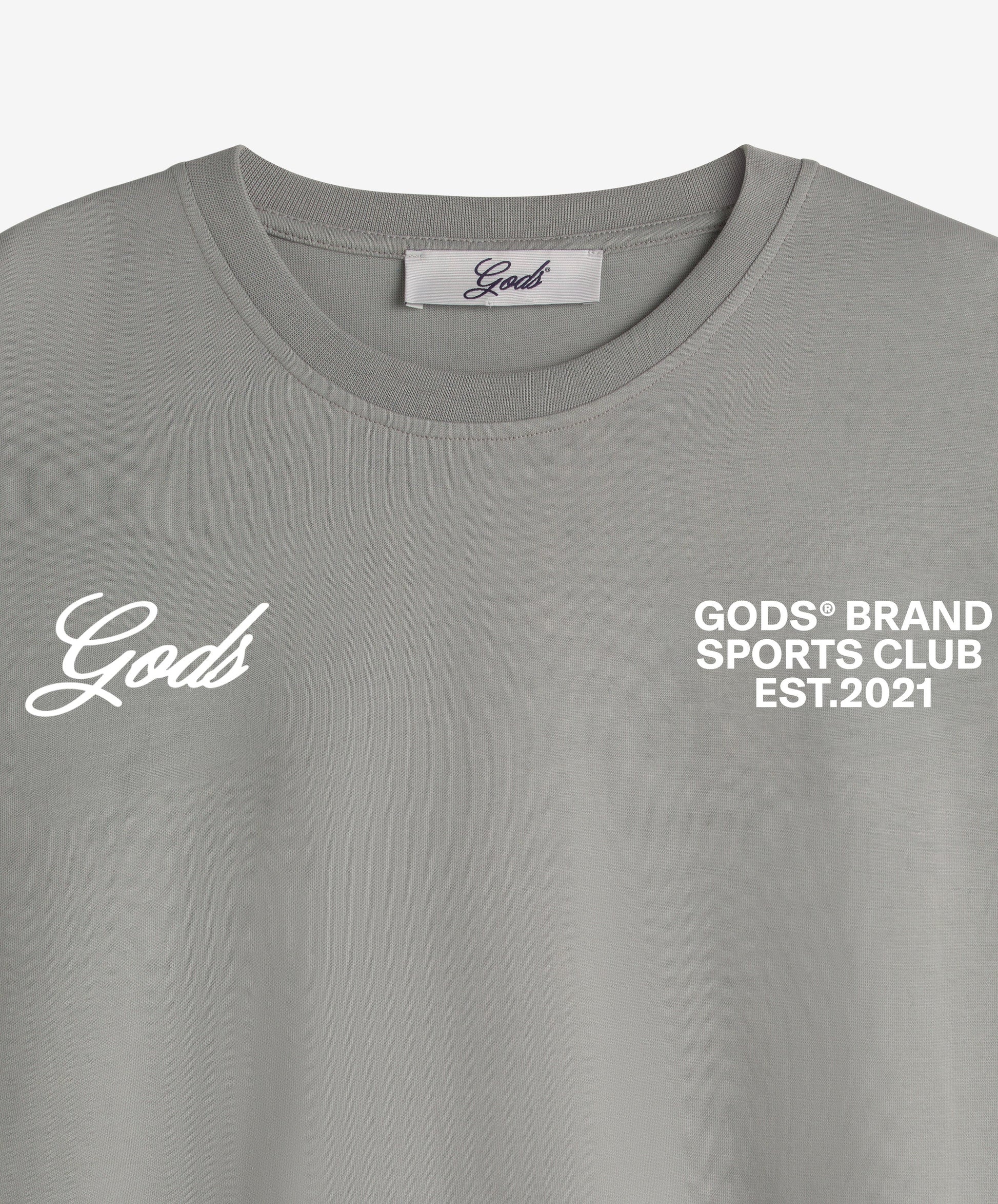 El diseño es limpio y se centra en la identidad de marca el pecho izquierdo lleva el logo Gods en fuente script bordado en gris, mientras que el pecho derecho incluye el texto "GODS BRAND SPORTS CLUB EST. 2021", un guiño a la estética de los clubes deportivos exclusivos