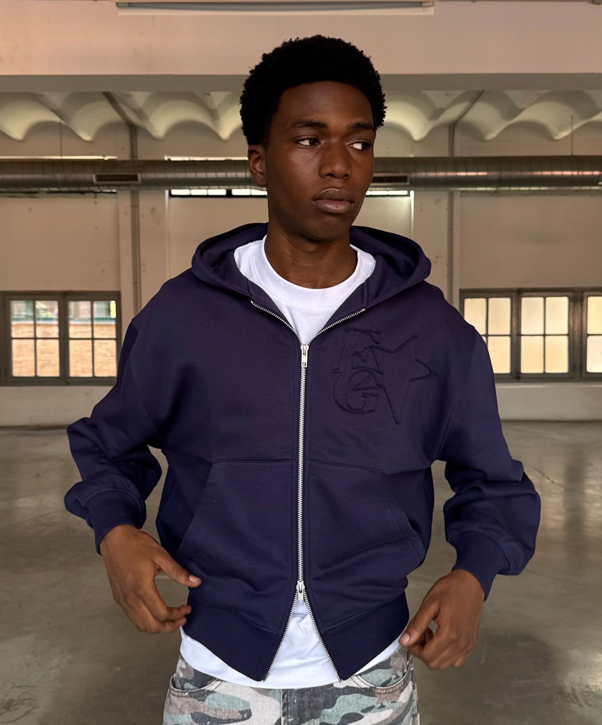 Hemos mantenido todo lo que te encanta, el corte cómodo y contemporáneo, la capucha envolvente y la calidad premium del tejido. La novedad reside en la cremallera frontal, que te permite adaptar tu estilo sobre la marcha, y en los detalles tonales. El emblemático logo FG con la estrella está bordado en el mismo azul marino, creando un efecto sutil y refinado tanto en el pecho como en la espalda.