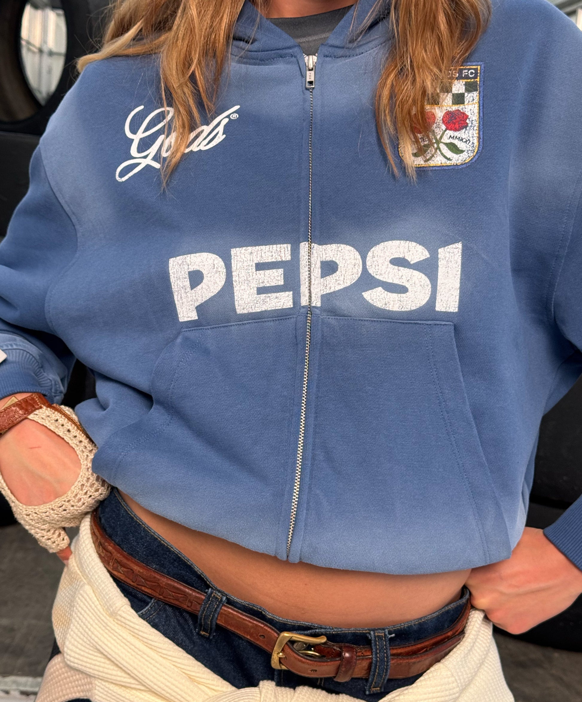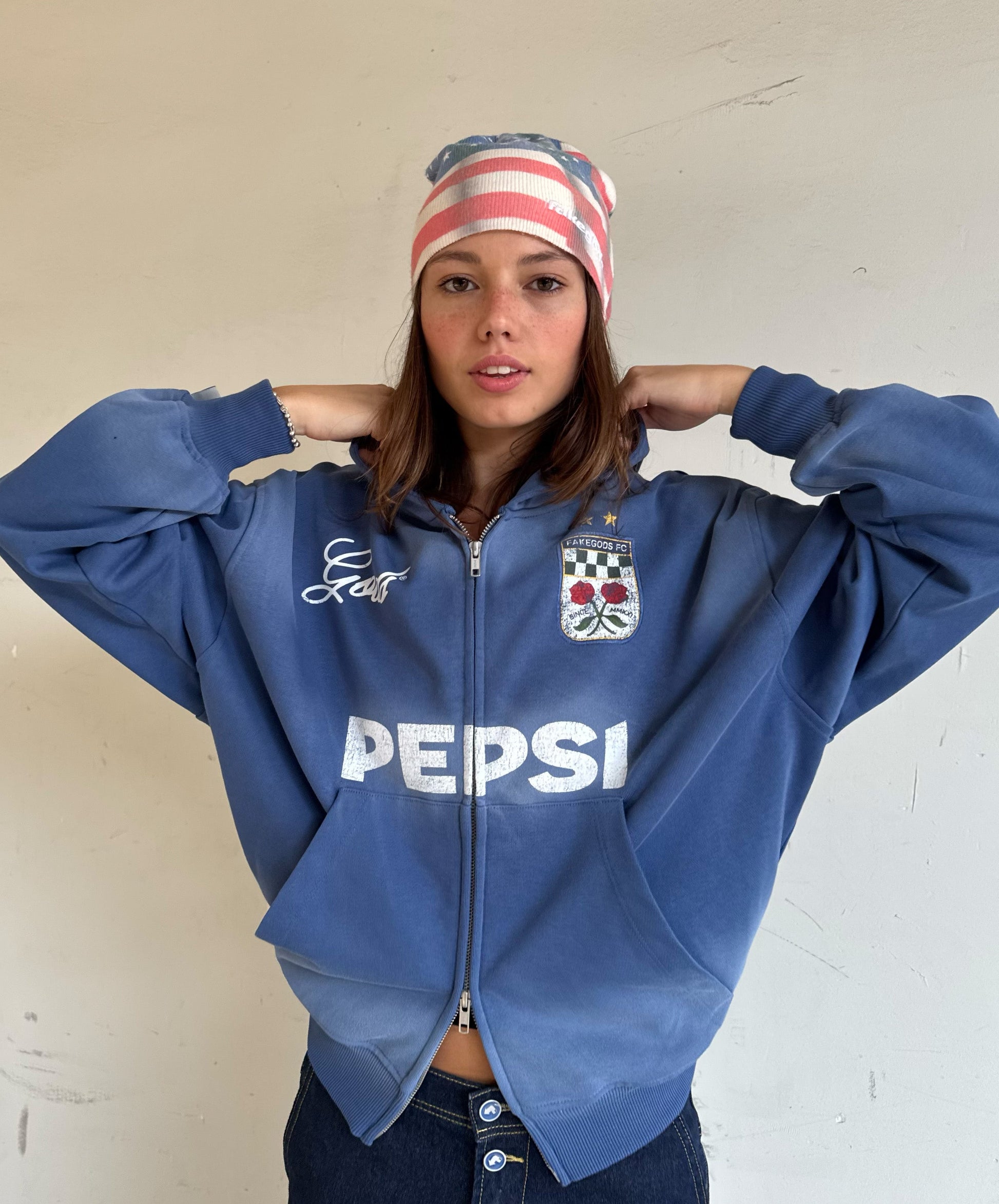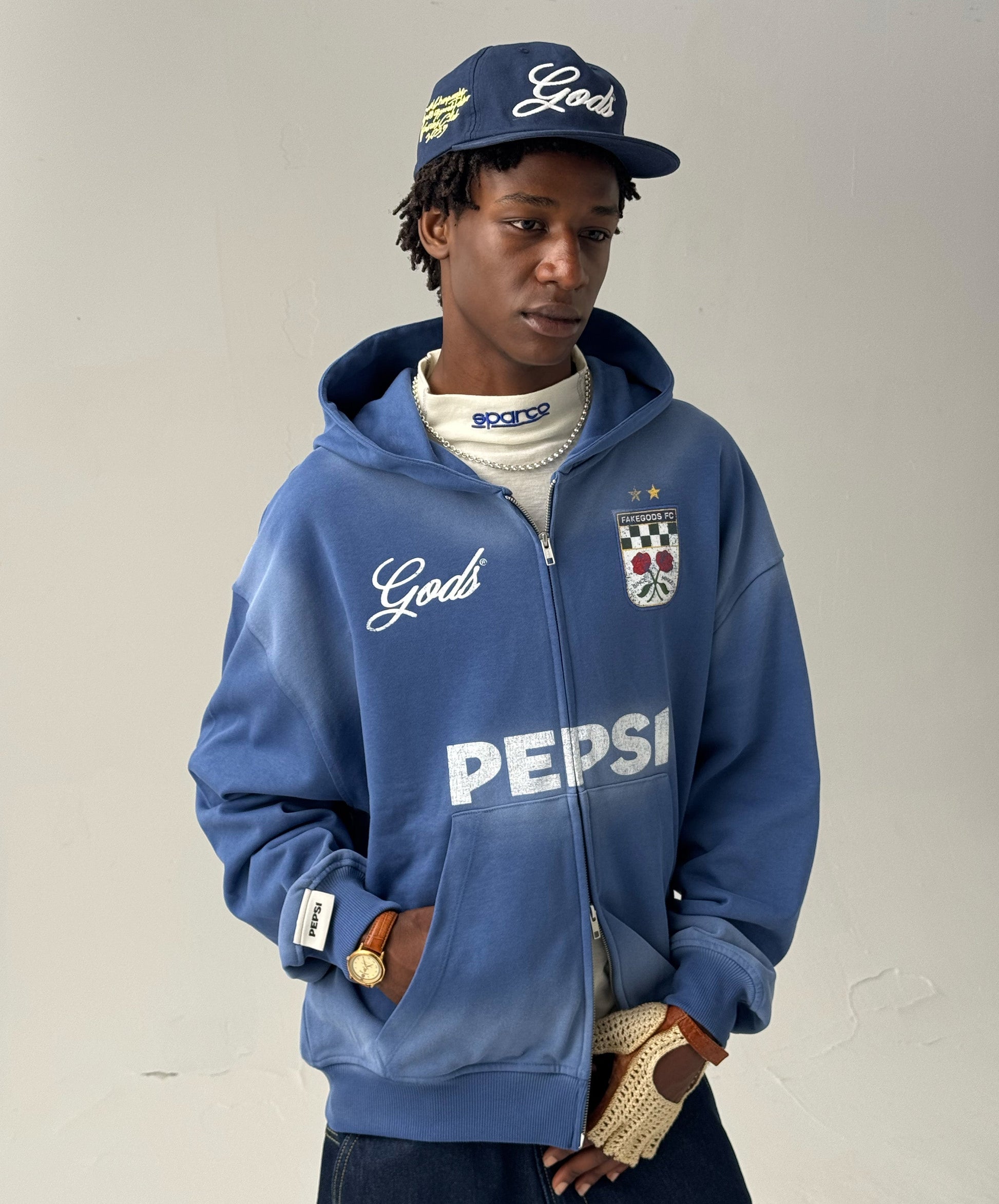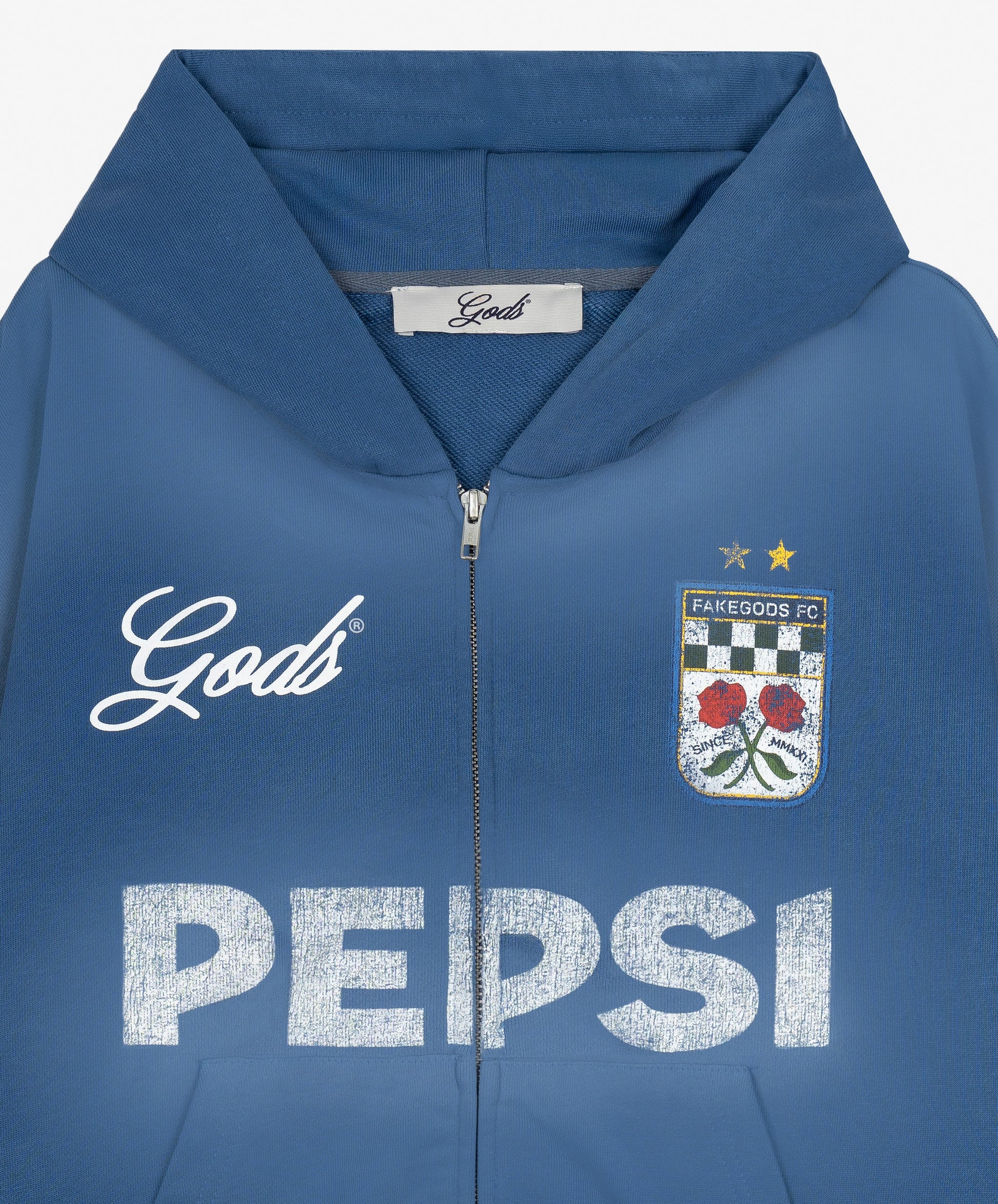 Sumérgete en un azul único con la Track Zipper Hoodie. Esta sudadera destaca por su exclusivo color azul con un sutil efecto airbrush en los bordes, creando un degradado suave que le da profundidad y un aspecto desgastado muy especial. Es una pieza central de la colaboración Pepsi x GODS, donde el color se convierte en protagonista.